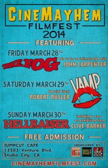 For its second year, CineMayhem Film Fest is breaking tradition in order to create a truly unique experience for indie horror fans at its new location, Jumpcut Café (13203 Ventura Blvd.) in Studio City, CA. Not only is CineMayhem expanding its celebration of independent horror to three days, beginning on Friday, March 28th and running through Sunday, March 30th, but there will also be NO CHARGE for fans to attend any of the CineMayhem 2014 events. Each night there will be contests and giveaways, with Scream Factory bringing some fun surprises for our celebration of THE FOG on March 28th.
