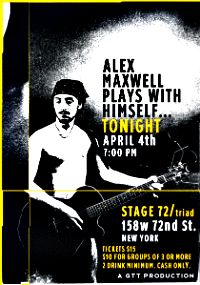 "ALEX MAXWELL PLAYS WITH HIMSELF . . . TONIGHT" Tired of lonely Friday nights? Put away your beauty products and turn off your cold shower to come watch someone else play with himself, Alex Maxwell that is, . . . and his guitar. On Friday, April 4th, Alex will be performing his one-man show "Alex Maxwell Plays With Himself. . .Tonight" with eccentric fun, music, and spectacle to excite viewers and leave them fulfilled. Who is Alex Maxwell? A man whose voice wails louder than the snarl of his guitar, determined to get through to you and leave you stunned by his Country Grunge Folk sound. So, come to Stage 72 at the Triad, 158 West 72nd Street at 7:00pm Friday April 4th for a night of music and discovery.