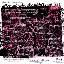 CALEB NICHOLS (USA) ~ a mixture of spoken word & cute songs about gay love DANCER ~ melodically rich art pop OCHRE ~ full charge emotional hardcore akin to Self Defence Family & Code Orange BLEAKS ~ chaotic & intense hardcore punk OTIS JORDAN ~ loose yet sharp bedroom jazz COWBOY BUILDERS ~ scrappy noise drenched free-form art rock GOSSIPER ~ melodic emo from Dundee I WANNA BE A TRUCK DRIVER ~ the best dang twee pop band JON RAMSAY ~ experimental piano and shouty man ELIOTS GRAVEYARD ~ jangly existential bedroom pop NOISE HZ ~ noise hz LISA JONES & COCO DE MAUL ~ spoken word & keyboard duo, first show ! MOINE ~ crushing black metal two piece GF ~ smart, catchy & layered indie rock two piece SCHANDE ~ fuzzy guitar pop, done solo (more exciting acts tbc!!!)
