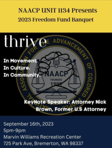 Keynote Speaker Attorney Nick Brown, former Western District US Attorney Highlighting African American Men in Business Special Guest Speaker James Bible, Attorney, and Past President NAACP Seattle/King County Awards, Live music, Silent Auction, Dessert Dash, and Historical Exhibit