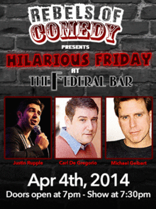 Rebels of Comedy presents Hilarious Fridays at the Federal Bar in North Hollywood. Come out and see a night of live comedy, featuring an awesome lineup of professional features and headliner comedians.