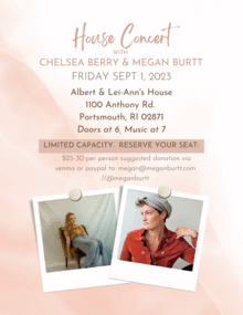 Come on out for an amazing and intimate evening of music with Chelsea Berry and Megan Burtt. If September 1 is anything like their last concert here in 2021, you'll be guaranteed to leave with a memorable night of music to last a lifetime. We have limited seating. Please RSVP and reserving your seat by sending a $25-30 per person suggested donation via paypal or venmo to: megan@megaburtt.com // venmo: @meganburtt. Please mark in the comments that you're reserving your seat/s for Sept. 1 in Portsmouth! See you soon!