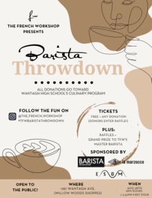The French Workshop announces the launch of its first-ever Barista Throwdown at its Wantagh location (1187 Wantagh Avenue). The event will showcase the many talents of the bakery-cafés baristas from across all four of its locations in Queens and Long Island, as they compete for a chance to win the enviable title of TFWs Master Barista. It will be held on August 28th, benefitting Wantagh High School's ever-expanding Culinary Program. In addition to the competition, raffles will be held featuring prizes from The French Workshop, as well as our sponsors Barista Magazine, Procreate Coffee, La Marzocco, and Espresso State of Mind.