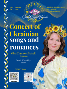 Ukrainian-American Soprano Olga Zhuravel Maselli Presents an intimate evening of beloved Ukrainian Songs, Arias, and Romances in Concert with Pianist Scott Wheatley. Ms. Zhuravel Maselli has performed at leading venues around the world, including leading roles with Rome Opera, Teatro Comunale Bologna, La Fenice in Venice, Macerata Festival, Carnegie Hall, and Merkin Hall in NYC.