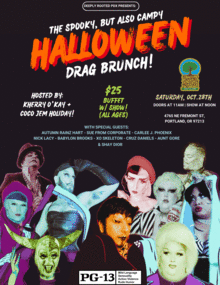 Debuting on Saturday, October 28th, 2023 -- join us for the campiest and spookiest drag brunch Portland has to offer! Hosted by Kherry O'Kay & Coco Jem Holiday (S2 Finalist, Camp Wannakiki).