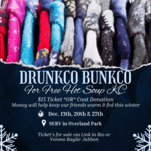 Tickets are $15 per person with the majority of proceeds going straight to the cooks of Free Hot Soup KC to help cover the supplies it takes to feed our friends in need each week. **OR** Bring a gently used Coat or Sleeping Bag and your ticket is covered!