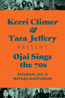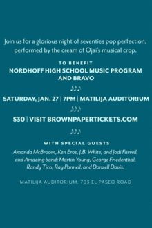 Join us for a glorious night of 70s pop perfection, performed by the cream of Ojai's musical crop. Joining Kerri Climer and Tara Jeffery are special guests: Amanda McBroom, Ken Eros, J.B. White, and Jodi Farrell, and amazing band: Martin Young, George Friedenthal, Randy Tico, Ray Pannell, and Donzell Davis. This is a benefit concert for Nordhoff High School's music program and Bravo.