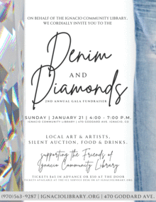Put on your best dress and join us for a night out at the library! Enjoy hors d'oeuvres & local wine. Special guest artists and their pieces will be available for viewing as well as a silent auction! Tickets can be purchased at the library, $45 in advance, $5o at the door all to support the Friends of the Ignacio Community Library. You can view the silent auction items here: