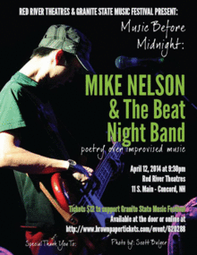 Mike Nelson and the Beat Night Band A staple from the famous Press Room in Portsmouth New Hampshire, Beat Night hosts Poets from all over new england who layer their spoken word over the completely improvised music. Mike Nelson is a published poet and a regularly featured poet at Beat Night. Together with the Beat Night Band, he will bring a new sound to Concord in what will be a memorable performance. The Beat night Band is: Chris Stambaugh - bass Mike Barron - drums Scip Gallant - keyboards Frank Laurino - percussion Scott Solsky - guitars