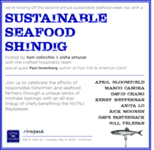 To kick-off this year's Sustainable Seafood Week NYC, produced by Village Fishmonger, Chefs Tom Colicchio and Sisha Ortúzar are hosting the first annual Sustainable Seafood Shindig, a fun and fast-paced tasting format showcasing a series of intimate dining experience throughout a fun cocktail reception. The event will feature sustainable seafood dishes, signature cocktails and conversation with chefs, producers and industry experts. Tasting Guests will be given reservations to chefs' tasting counters, each counter featuring two chefs, a fisherman or seafood farmer, and paired beverage. Tasting Guests will enjoy cocktails, canapés and clams and oysters on the half shell. Tasting Guests will also have unlimited access to the cocktail party.