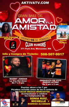 GRAN BAILE DEL AMOR Y LA AMISTAD EN CLUB RUMORS WORCESTER el VIERNES 16 DE FEBRERO. Empezando de 7 a 9 pm con La Voz del Amor, MANNY JORDAN, e invitados especiales NICOLE, MICHELLE (La Selena Boricua) y el Duo Baachatero J BRUNO Y JULIETA XANTOS en vivo y luego de 9 pm a 2 am, Rumba y Baile con LA ORQUESTA SABOR LATINO todando Bachata, Merengue, Salsa, Reggaeton y Cumbia. Los Mejores DJ's de la Ciudad nos estaran acompañando toda la noche. Habra Picaderas complementarias de 7 a 9 pm por cortesia de TACOS MEXICO WORCESTER. Estaremos celebrando el Cumpleaños de RODRIGO ALVARADO, MICHELLE GONZALEZ y de SONIA RUIZ de AKTIVA RADIO & TV.