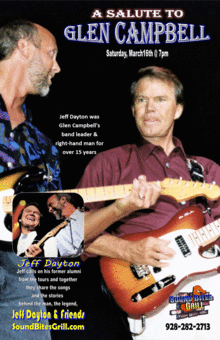 Jeff Dayton has been busy since his 15 plus years with Glen Campbell. In "A Salute To Glen Campbell" Jeff will tell the stories and play the music that he experienced with his 15years on the road and in the studio with the legendary Glenn Campbell!!