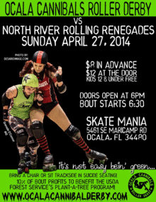 The Ocala Cannibals Roller Derby team hits the track again for their third home bout of 2014 season. This time they will take on the women from North River Rolling Renegades, for the very first time, on April 27th, 2014. Doors open at 6:00pm and the bout starts at 6:30. The entry fee is $8 in advance, $12 at the door, and as always, kids 12 and under are free. The charity for this bout is The USDA Forest Service's Plant-A-Tree Program. 10% of all proceeds will go to this organization, as well as any monetary charitable contributions. Remember to bring a chair or take part in our trackside suicide seating. Just remember you must be 18 years of age to sit on the edge of danger! Come cheer on your favorite derby girls as they take on their newest opponent!