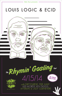 Louis Logic & ECID will be headlining the next House Of Lyrics event at Jimmy's Saloon on Saturday April 5th!! It's all part of their nationwide Rhymin' Gosling Tour presented by Fake Four Inc. They'll be supported by New England's #1 Feel-Good MCs, DirtyDurdie and one of the best bands in Newport, Pier Jump. Kee-Words, Kev Diggs, AfterLife and Lady Guenevere are also on the bill so it's definetely not one to be missed. Hosted by Chuck Reeves with DJ's Uniek and tKO (Beatz and Pieces crew) on the wheels of steel all night. $8 advanced tickets \\ $12 at the door. 9pm-1am. Strict 21+