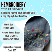 Join us for a fun session where we'll jazz up the hems of your favorite pants, jackets, or shirt sleeves with decorative embroidery! Bring along your own clothing piece and let your creativity soar as we teach you the art of "Hembroidery."