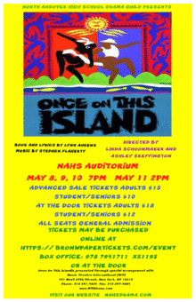 Once on This Island is a contemporary love story based in the Carribean. With non-stop singing and dancing, it tells the story of Ti Moune, a peasant girl who rescues and falls in love with Daniel, a wealthy boy from the other side of the island. When Daniel returns to his side of the island, the Gods who rule the island guide Ti Moune on a journey which tests the strength of her love against the forces of prejudice, hatred and death.