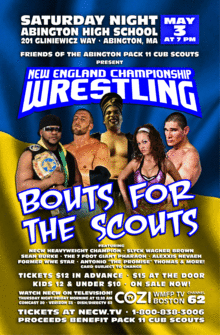New England Championship Wrestling returns to Abington for another big night of BOUTS FOR THE SCOUTS with proceeds to benefit the Abington Pack 11 Cub Scouts.