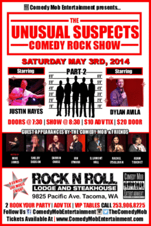 Saturday May 3rd, 2014 Comedy Mob Entertainment presents "The Unusual Suspects Comedy Show" Part 2, starring two of the Northwest's funniest comedians, Justin Hayes & Dylan Avila. The show will be hosted by Comedian Mike James. The show will include guest appearances by some of the wildest comedians in The Comedy Mob & their Funny friends. The Unusual Suspects on this show is Shelby Dodson, Darrin Chase, Ian O'Mara, D. Lamont Hall, Rachel O'Sullivan, and Adam Touchet. This exclusive event will also have live rock music provided by the talented Hooligan Ryan.