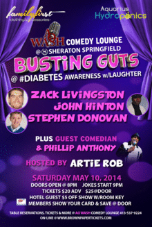 A O Wash Comedy Lounge MOTHER'S DAY WEEKEND COMEDY SHOW !!! BUSTING GUTS @ #DIABETES AWARNESS W/LAUGHTER Sheraton Springfield, Massachusetts Monarch Place Hotel with Comedian's ZACK LIVINGSTON , JOHN HINTON, STEPHEN DONOVAN plus Guest Comedian's Phillip Anthony & More Hosted By Artie Rob SATURDAY MAY 10th 2014 Doors Open @ 8pm Jokes Start 9pm Tickets $20adv $25 @ door