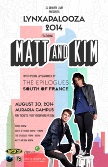 Ready for food, fun, and live music? CU Denver Live! presents Lynxapalooza, the second annual CU Denver concert, featuring nationally acclaimed artists Matt and Kim! Sponsored by Channel 93.3, this outdoor event will include food trucks, a photobooth, and great local music throughout the evening. Come early for fun, stay late for great music! Doors open at 5:30pm. Tickets are $15 for CU Denver students and $25 for the public.