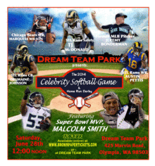 Celebrity Softball game featuring Seattle Seahawks Malcolm Smith, Super Bowl MVP 2014. Malcolm has asked present and future NFL players to join the game. These friends include but may not be limited to;