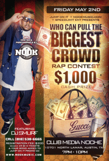 Sign up and compete to win $1,000 cash and be featured on "The A" Show that debuts Thursday June 27th. The group that brings the biggest crowd and does the best show will win. The event will be hosted by NOOK and judged by Stan Cobble (platinum promoter responsible for many successes in the music industry), DJ Hella Yella (as seen on BET's 106 & Park, Austin Chronicle's Best DJ of the Year and multiple SEA Award winner) and the crowd!!!! Call NOOK right now at (818)538-6665 to sign up or go to www.nookmusic.com. Proceeds of this event go towards J.O.I. Community Outreach's efforts to bring back the past popular Jump On It Summer Concert Series kicking off June 18, 2014!!!