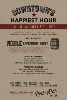 Noble Experiment Did you know there's a Speakeasy in Red Star Tavern? You do now. Check out our Noble Experiment with Prohibition-era cocktails, bites and a live performance by Johnny Martin!