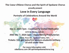 The Coeur d'Alene and Spirit of Spokane Choruses are joining forces to present Love in Every Language-Portraits of Celebrations Around the World. We are excited to give two performances one at Opportunity Presbyterian Church in Spokane Valley and one at Community United Methodist in Hayden/CdA.
