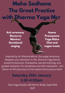Inspired by Sri Dharma Mittra, this yoga ceremony deepens your devotion to life. Dharma Yoga blends powerful postures, Pranayama, sacred chanting, and guided relaxation for wholeness and Self-realisation. Join Simon on this journey to inner peace and a joyous heart.