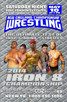 New England Championship Wrestling returns to Beverly with a very special event, the 2014 IRON 8 Championship, taking place on Saturday night, May 10th at the Cove Community Center, 19 East Corning Street in Beverly with a 7 PM bell time.