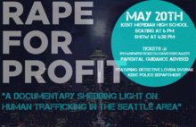 Rape for Profit, produced in Seattle, sheds light on the growing problem of human trafficking in our area. The Southeast King County Coalition Against Trafficking (SEKCAT) is hosting the screening to raise awareness about human trafficking. Come to learn more about this issue and how to protect our youth and families.