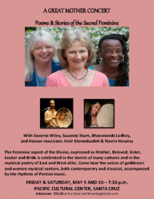 A Great Mother Concert features readings of sacred poetry and stories of the Divine Feminine from many traditions, accompanied by the rhythms of Persian music. Three local performers, Suzanne Sturn, Bhavananda Lodkey, and Savarna Wiley will present the voices of the ancient goddesses of many cultures and a variety of mystic women and seekers both contemporary and classical on Friday and Saturday, May 9 and 10, at 7:30 p.m. at the Pacific Cultural Center in Santa Cruz, with music by Amir Etemadzadeh and Nasirin Hosai.