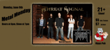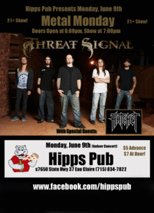 Hipps Pub presents Metal Monday featuring Touring Artist "Threat Signal" and "Hatchet". This is a 21+ show and is an early evening show with doors opening at 6:00pm and show starting at 7:00pm! For more info call (715) 834-7822.
