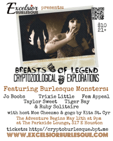 More than just doctored photographs of the Loch Ness Monster, drunken stories of the Mothman, and faked footprints of Bigfoot (Bigfeet?), cryptozoology is the chase after animals of dubious repute by wide eyed fanatics who dare all for the barest of glimpses. For our next endeavor, the cast of Excelsior Burlesque delves into the steamiest of swamps, scales the barest of cliffs, and plumbs the deepest, dampest caves to bring you acts of such legend and magnitude they can barely be contained by our stage. On May 12th, Jo Boobs bring her full weight to the stage - leveling some things and erecting others. Trixie Little's siren song will entice you closer, only to be caught in the wonderful and terrifying clutches of Fem Appeal. Tiger Bay has two very impressive attributes, right down below her ankles. Taylor Swift crosses the Hudson to illuminate us on just what's running around in those pine barrens, and Ruby Solitaire wants to burn the world down! Featuring gogo by "hoppy go lucky" Kita St. Cyr - this evening's line up with make you believe the legendary is real!