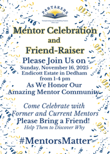Please Join Us on Sunday, November 16, 2025, at the Endicott Estate in Dedham from 1-4 as We Honor and Cheer Our Amazing Mentor Community. Come Celebrate, Mingle, Meet, Chat, and Discover Why Mentors Matter!