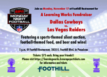 Come join us for Monday Night Football fundraiser at Foothill Restaurant on Monday, November 17 from 5 to 8 p.m.! Tickets cost $50 and include food, beer, wine, and specialty drinks, and attendees will be able to bid on valuable prizes in a silent auction. All proceeds will support the programs and wraparound services that directly benefit the students of Learning Works. Foothill Restaurant is located at 2835 E. Foothill Blvd. in Pasadena. What is Learning Works? Learning Works is a school providing a personalized, rigorous academic program and relevant life skills to traditionally underserved Pasadena-area students in grades 6 12 who have withdrawn or are in danger of withdrawing from mainstream education without attaining a high school diploma. Learning Works employs alternative methods and practices to mitigate the issues that prevent our students from pursuing their high school diploma including substance abuse, teen pregnancy, homelessness, domestic violence, neurodivergence, etc.and allows them to focus on their education in their own time and on their own terms. Since the school was started in 2008, we have graduated 1,253 young people who would not have otherwise earned their high school diploma. We are partner with Pasadena Unified School District and Homeboy Industries.