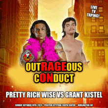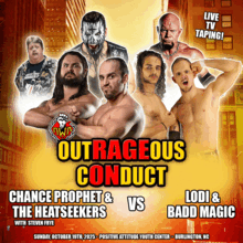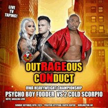 RWA: Outrageous Conduct! RWA returns to Burlington, NC for a Huge Live Event featuring all of your favorite RWA Superstars such as 6 Time TNA Knockouts World Champion Angelina Love, NWA Star Psycho Boy Fodder, the debut of WCW/WWE Legend 2 Cold Scorpio, Survivor Reality TV Show Legend, Jonny Fairplay, The Dark Child Chance Prophet, WCW Legend Lodi, The Heatseekers and much, much more!!!!!