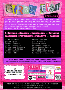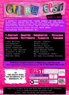 Grrrl Fest is a benefit celebrating young women in the arts. The Festival will take place on June 14, 2014 @ The Silent Barn located @ 603 Bushwick Ave, Brooklyn, NY. The Festival will start at 12pm and will run into the night. Tickets can be purchased in advance online @ $8.00 a piece. Guests can also purchase tickets for $10.00 at the door on the day of the event. All tickets include all day access to the benefit. This event will help to raise money for arts education & various nonprofit organizations that are helping young women in NYC. Some of the organizations benefitting from this event are: The Willie Mae Rock Camp for Girls,The Center for Arts Education, CHiPS,The Beacon School,Bluestockings, Lower East Side Girls Club and more. Grrrl Fest will include many fun things throughout the day such as an opportunity to purchase art and writing made by young artists, a Craft making workshop, Music, Dancing, Book/Art/Zine Sale,Button Making, Zine Workshop,Glitter Tattoos,Tarot Card Reading,Spoken Word,Phantasm Clothing, Palomino Jewelry ...and much, much more. This event will also include a Silent Auction with a portrait of "Keith Haring" made by artist, Shepard Fairey (made possible by The Keith Haring Foundation). Here is a list of some of the bands & performers: Pottymouth,Fleabite,T.Rextasy,She monster,Petalwar (Featured at SXSW 2014),Palehound,Lina McGinn,Cachabacha,Daddy Issues,Granted,Bella & Rayssa,Lindsay & Meila,Khaya Cohen (Featured on "The X Factor"),Marina Zéro,Rachel Chevat,Webb Crawford,Dirty Girlz,Micaela Gold,Aminata Siby,Savannah Galvin,Ebun Nazon Power,Mika Steele,Paola Velarde, MC 'Screamin' Mimi" Lotan, DJ Rob Silverman-Ascher.
