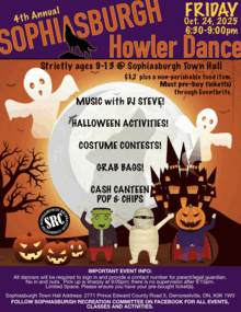 Come have a great, safe and fun time at Sophiasburgh Rec Committee's 4th Annual Sophiasburgh Howler Youth Dance!! Friday, October 24, 2025 6:30 - 9pm Sophiasburgh Towh Hall in Demorestville, Prince Edward County 2771 Prince Edward County Road 5, Demorestville, ON, K0K 1W0 STRICTLY AGES 9-13 Music with DJ Steve! Halloween Activities! Costume Contests! Grab Bags for All! Cash Canteen (pop and chips) $12 entrance fee + a non-perishable food item. Must buy tickets through Brown Paper Tickets.