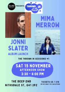 On Saturday 15 November, from 3:30pm to 6:00pm, we'll have sets by Jonni Slater, launching his new album Between The Shadows, and Mima Merrow.