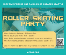 When: Saturday, February 21 from 4-6pm Where: Southgate Roller Rink - Seattle What: Tons of fun roller skating (rentals included) and socializing Who: Families touched by adoption in the greater Seattle area