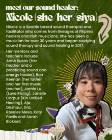 More about our Sound Healer Nicole Vallestero Soper, (She/Her/Siya): Nicole is a Seattle-based sound therapist and facilitator who comes from lineages of Filipina healers and Irish musicians. She has been a musician for over 30 years and began studying sound therapy and sound healing in 2017. Her mentors and teachers include: Anne Susas (her mother and a practicing sound and energy healer), Ron Keenan (her father and her first music teacher), Jamie Lu (Love Rising), Janelle Corpuz (Kin Unified Healing), Aja Dashuur, Dra. Rosales Mesa, Katy Pavlis, and Sarah Bicknell.