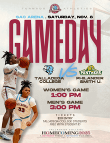 Join us at SAC Arena for a high-energy Homecoming 2025 basketball showdown as the Talladega College Tornadoes take on Philander Smith University Panthers.