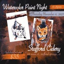 $35 A PERSON - Join us for a fun night of painting at The Stafford Cidery in Stafford Springs, CT. You will be supplied with 2 5x7 pieces of watercolor paper as well as supplies to paint with watercolor. Price includes one beverage! We will be going with a woodland critter theme but a few variations will be shown in case you're feeling creative!