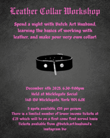 Spend a night with Butch Art Husband, learning the basics of working with leather and making your very own collar! December 4th 2025, 6-9pm, at Micklegate Social.