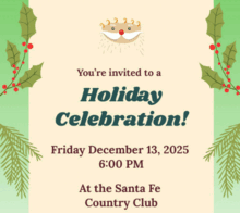 Come join us for our annual GOP Christmas Party at the Santa Fe Country Club on Friday, December 13th at 6pm This site is to order your dinner. All extras included in your price, including dessert. We will have great food, entertainment and a very special pinata for everyone to enjoy.