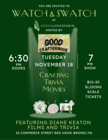 Good Crafternoon invites you to Watch & Swatch, the first of its name as a monthly event at Green Lung Studio in Red Hook, Brooklyn. ------------------------------