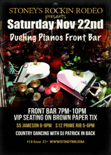 Don't miss Dueling Pianos Live Stoney's Front Bar! Saturday November 22nd 7-10PM Talented, Funny Performers!