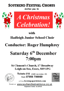 Hadleigh Junior School Choir, a talented group of music makers join Southend Festival Chorus again to entertain you in a concert of Christmas carols both well known and perhaps new to some to get you in a festive mood in St Clement`s Church, Leigh- on-Sea, Essex