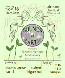 we are a collection of landtenders connected by alemany farm who invite you to gather with us on the earth for an afternoon of sounds. please join us on sunday, nov 16 from 11 am - 3 pm for music by atomic amor, kat le, Stelune and bigtexlex. food carefully prepared by mac, tati + tamgus, and is included in ticket price, because we believe in both physical and spiritual nourishment <3